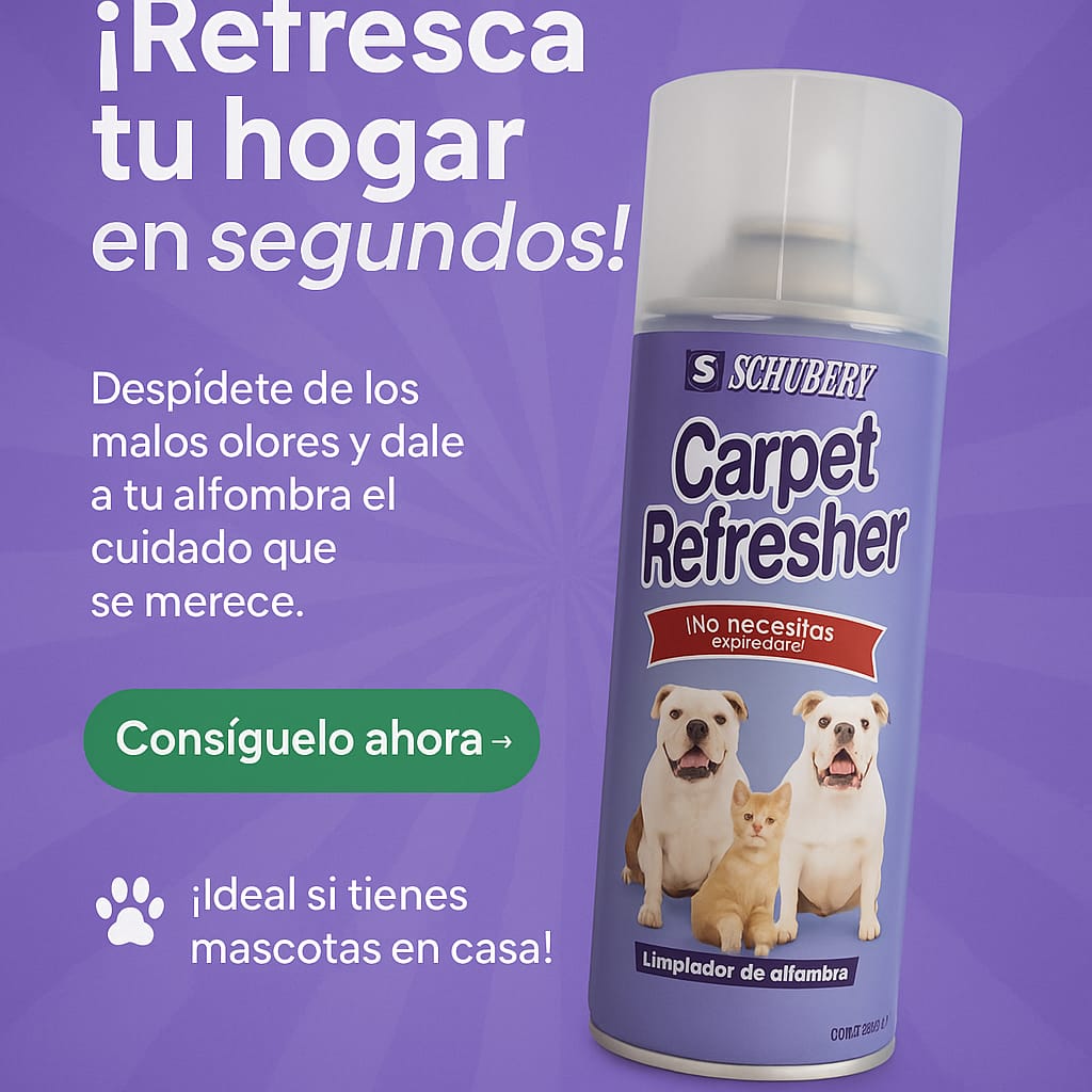 Descripción🧼 Descripción del Producto: Carpet Refresher Schubert es el aliado perfecto para mantener tus alfombras frescas, sin necesidad de aspiradora. Su fórmula en espuma ligera neutraliza los malos olores, incluso los causados por mascotas, dejando un aroma agradable en segundos. Ideal para hogares con perros o gatos, este limpiador actúa de forma rápida, segura y eficaz. 🟣 Contenido: Espuma en aerosol de secado rápido. 🟣 Apto para usar cerca de mascotas. 🟣 No requiere enjuague ni aspirado. --- 🎯 Ángulo de Venta: ✨Frescura instantánea para hogares con mascotas. Vende tranquilidad, limpieza y practicidad. Este producto está pensado para personas que: Tienen mascotas y quieren eliminar olores sin esfuerzo. Buscan una solución rápida sin necesidad de usar una aspiradora. Quieren mantener una buena presentación del hogar sin complicaciones. Ideal para: Mamás, amantes de los animales, dueños de departamentos pequeños, oficinas pet friendly, hogares con niños. --- 🔥 Llamado a la acción: ¡Refresca tu hogar en segundos! Despídete de los malos olores y dale a tu alfombra el cuidado que se merece. 🛒 Consíguelo ahora y disfruta de un ambiente limpio, fresco y sin esfuerzo. 🐾 ¡Ideal si tienes mascotas en casa!